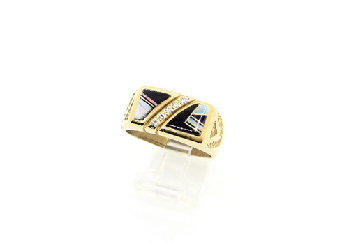 The ring is set in 14k gold and handcrafted by a local artist who signed and stamped the piece for authenticity. The artist inlayed black onyx and white opal. The diamonds in the ring are .25 of a cart.