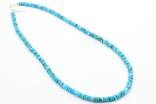 The necklace is handcrafted by a local Navajo artist. The turquoise comes out of the Kingman mined. The necklace is 20 inches in length.