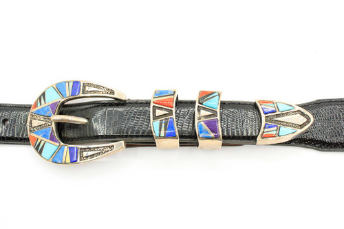 The ranger buckle is sterling silver and handcrafted by a Navajo artist named Calvin Begay. The buckle is made for a 1 inch belt. The artist inlayed turquoise, lapis, opal, coral, onyx and purple sugalite. This ranger buckle stunning and goes with everything.