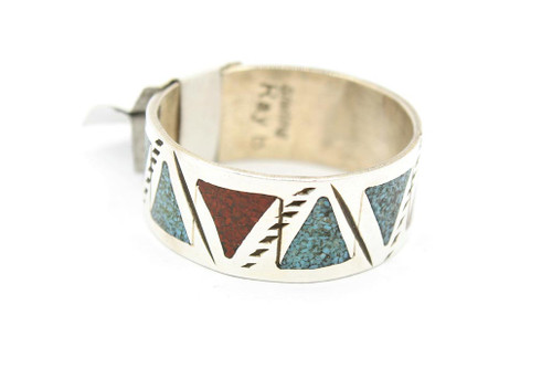 This style of work is called chip-inlay. The ring is sterling silver and handcrafted but a Navajo artist. The artist used turquoise and coral.