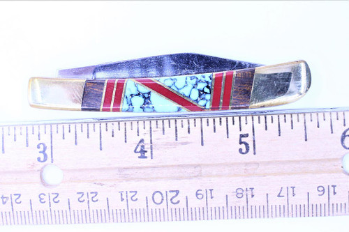 This knife is all handmade by a Navajo artist. The knife has 2 different blades. The stones that were inlayed in the knife are, coral, turquoise and onyx. The knife, with the blade open measures at just under 5 inches.