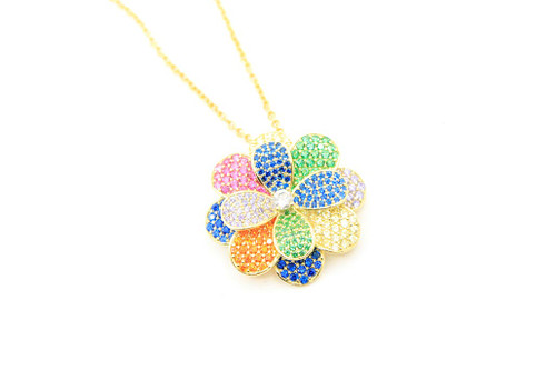 The necklace is set in sterling silver and handcrafted. The artist who makes our designer pieces is named Thane. He put 3 layers of rhodium, so the gold does not come off. The artist always used high quality swarovski crystals, all different colors. The necklace is a beautiful piece.