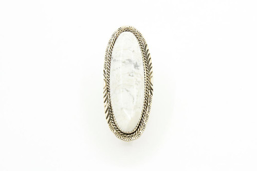 The ring is sterling silver and handcrafted by a local Native American. The ring has a beautiful white buffalo stone. The ring is about 2 inches in length.