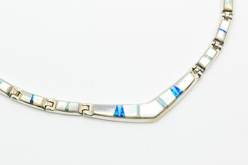 This is all sterling silver and handcrafted by one of our featured Navajo artist. Each piece of jewelry is handcrafted and signed by our Native-American artists and comes certificate of authenticity. This artist put a few types of stones in this necklace, mother of pearl, turquoise and blue opal. This necklace is 18 inches in length. Stunning necklace and earring combo that will go with everything!! A most have!