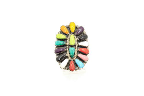 The ring is sterling silver and handcrafted by a Navajo artist who signed and stamped the piece for authenticity. The artist used turquoise, coral, orange oyster shell, onyx, lapis, howalite, malachite and denim lapis. A very unique ring.