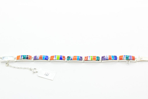 This bracelet is handcrafted and signed by a Navajo artist. It is sterling silver and has high grade natural stones in it. The stones used in the bracelet are; Sleeping Beauty Turquoise, Mountain Turquoise, Lapis, Gaspite, White Opal, Sugalite, red and orange Oyster Shell. The bracelet is 7 inches in length and can be altered to whatever length is needed.