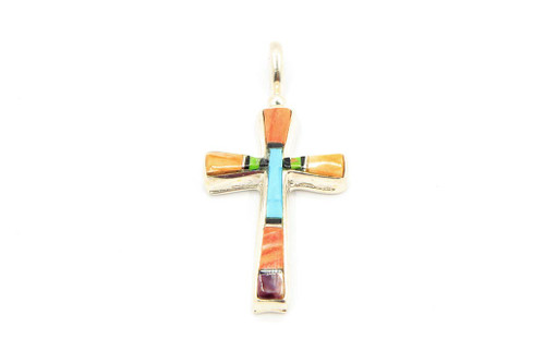 This cross is sterling silver and handcrafted by a Navajo artists. The artist used turquoise, oyster shell orange, purple, red oyster shell and gaspite. The piece is 1.25 inch in length.
