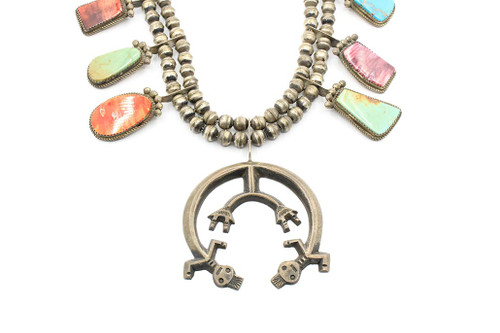 This necklace is sterling silver and handcrafted by a Navajo artist who signed and stamped the piece for authenticity. The artist used a few shades of turquoise, Royston turquoise, Kingman turquoise, orange oyster shell, red oyster shell and purple oyster shell. the necklace is 26 inches in length and has sterling silver beads, strung on a silver chain.
