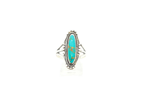This ring is sterling silver and handcrafted by a Navajo native of American artist. The stone that is used is a green turquoise. The ring is 3/4 of an inch in length and just around half an inch in width.