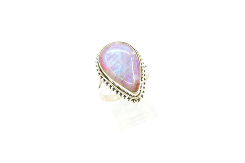 The ring is all sterling silver and handcrafted. The artist used a pink moon stone. This ring is for someone who likes pink.