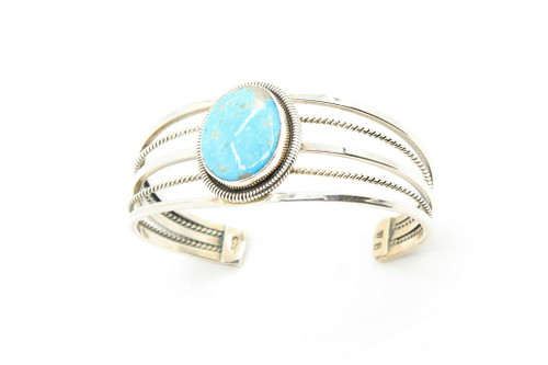 The bracelet is sterling silver and handcrafted by a Navajo artist who signed and stamped the piece for authenticity. The stone used in the bracelet is called Kingman turquoise.