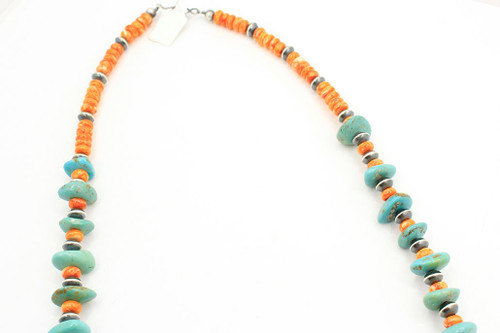 The necklace is handcrafted by a Navajo native American. The turquoise is from the Kingman mined located in Arizona. The artist also used orange oyster shell and silver beads. The necklace is 24 inches in length.