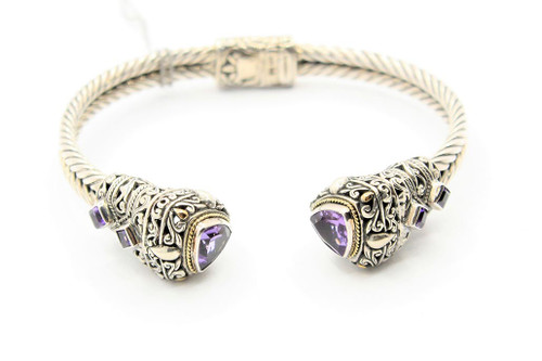 The bracelet is sterling silver and handcrafted by one of our fashion designers. The bracelet has accents of 18k gold on the bracelet. The stones used on the bracelet is amethyst. The bracelet is also hinged in the back of the bracelet to help comfort fix.