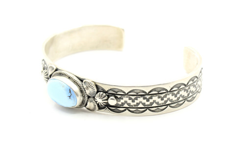 The bracelet is sterling silver and handcrafted by a Navajo artist who signed and stamped the piece for authenticity. The turquoise in the bracelet is called Golden Hills turquoise located in Europe.