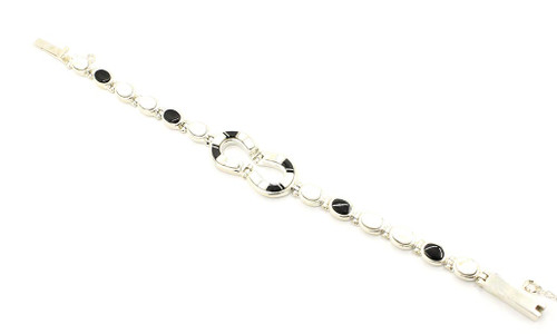 The bracelet is sterling silver and handcrafted by a Navajo artist. The piece is signed and stamped for its authenticity. The bracelet comes with a certificate of authenticity, as well. The stones that are featured in the piece are white buffalo and black onyx. The bracelet is a piece of artwork.