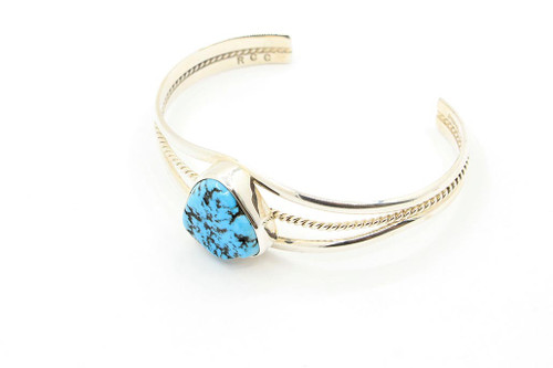 The bracelet is sterling silver and handcrafted by a Navajo artist who stamped the piece for authenticity. The stone used in the bracelet is called Kingman turquoise.