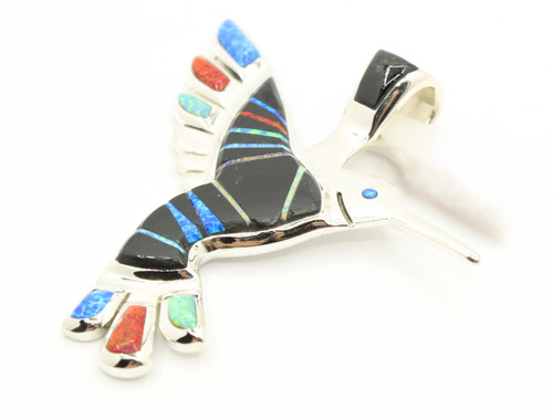 This pendant is one we can't keep in stock. One of our best-selling pendants. The pendant is all handmade by a Navajo artist who signed and stamped the piece for authenticity. The stone that are inlayed in the bracelet are, black onyx and multiple different color opals. A stunning piece.