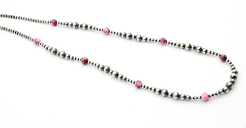 The necklace is sterling silver and handcrafted by a Navajo artist. The necklace has silver beads, different millimeter with Mojave purple beads. A beautiful necklace.