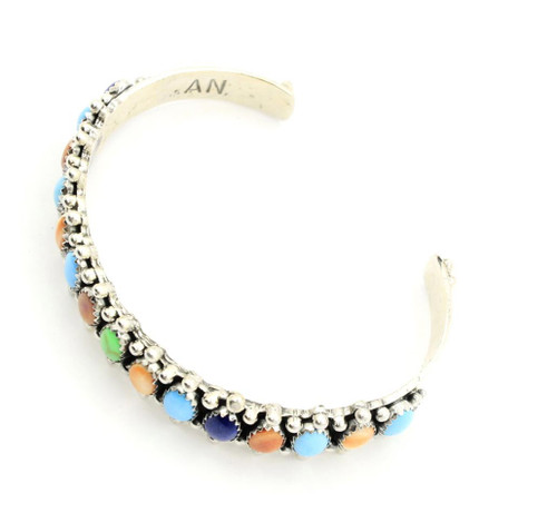 The bracelet is sterling silver and handcrafted by a Navajo artist who signed and stamped the piece for authenticity. The artist used turquoise from Kingman, Arizona, red coral, orange oyster shell; green Gaspite and lapis. The bracelet is a piece of artwork you can wear.