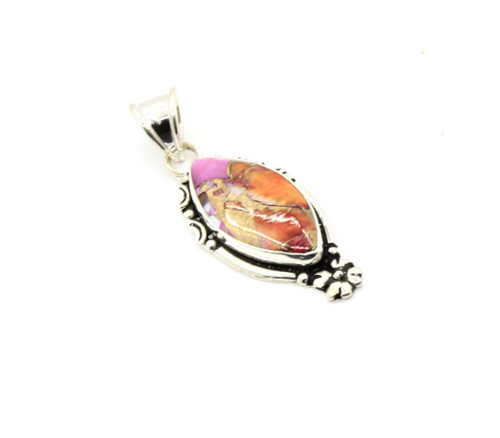 The pendant is sterling silver and handcrafted by a Navajo artist. The stone used in the pendant is called, purple spiny oyster. A very unique color.