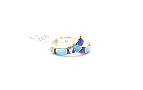 What a fun and new color combo with accents of purple. The ring is sterling silver and handcrafted by a Navajo artist. The ring is signed and stamped for its authenticity. The ring comes with a certificate of authenticity, as well. The stones that are featured in the ring are, a few shades of turquoise, lapis, mother of pearl, and purple sugalite. A great piece you can wear everyday!