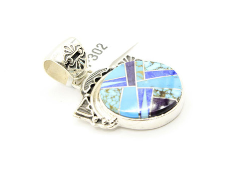 What a fun and new color combo. The pendant is sterling silver and handcrafted by a Navajo artist. The piece is signed and stamped for its authenticity. The piece comes with a certificate of authenticity, as well. The stones that are featured in the piece are, a few shades of turquoise, lapis, mother of pearl, onyx and sugalite. A great piece you can wear everyday!