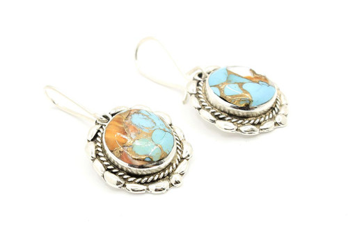 The earrings are sterling silver and handcrafted by a local Native American artist. The earrings are 1.5 inches in length. the artist used a stone called spiny turquoise.