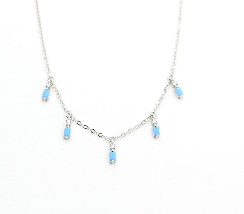 The necklace is sterling silver and hand crafted by a local artist. The artist used turquoise and crystals. The necklace can be altered to 3 different lengths 16, 17 and 18 inches.