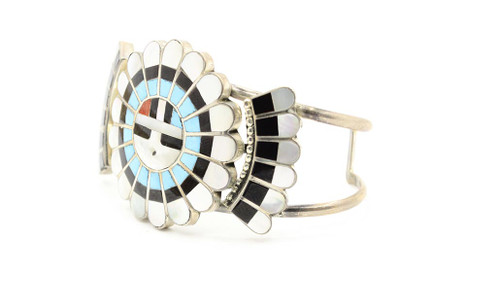 The bracelet is sterling silver and handcrafted by a Zuni artist who signed the bracelet for authenticity. The artist used sleeping beauty turquoise, coral, onyx and mother of pearl.