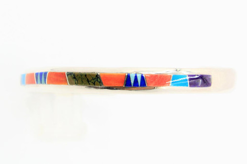 Each piece of Lazuli Designs is handcrafted and signed by our Native-American artist and is made of sterling silver and high grade natural stones. This item comes with a certificate of authenticity. The stones that are featured in the cuff bracelet are, Kingman turquoise, lapis, orange oyster shell, red oyster shell, sleeping beauty turquoise and sugalite .