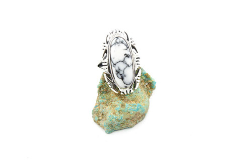 This awesome everyday ring is sterling silver and hand crafted by one of our local Navajo native of American artist. The stone that is used in the ring is called, white buffalo. The ring is just over 1 inch in length and the width is half an inch.