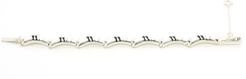 One of our best sellers because the white and black goes with everything. This bracelet is all handmade by a Navajo artist who signed and stamped the piece for authenticity. The stone that is inlayed in the bracelet are onyx and white buffalo. The bracelet is 7 inches in length and can be altered if need be. A piece of artwork!