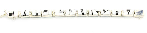 The bracelet is all sterling silver and handcrafted by one of our featured Navajo artist. Each piece is handcrafted and signed by our Native-American artists and comes certificate of authenticity. The stones that the artist used are white buffalo and black onyx on one side and the other side has sleeping beauty turquoise. The bracelet its 7.5 inches in length. Just stunning piece of artwork!!