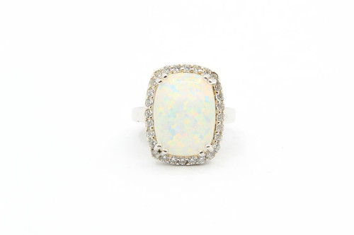 Description This ring is sterling silver and dipped in rhodium. The ring has a white opal and cz around the opal.